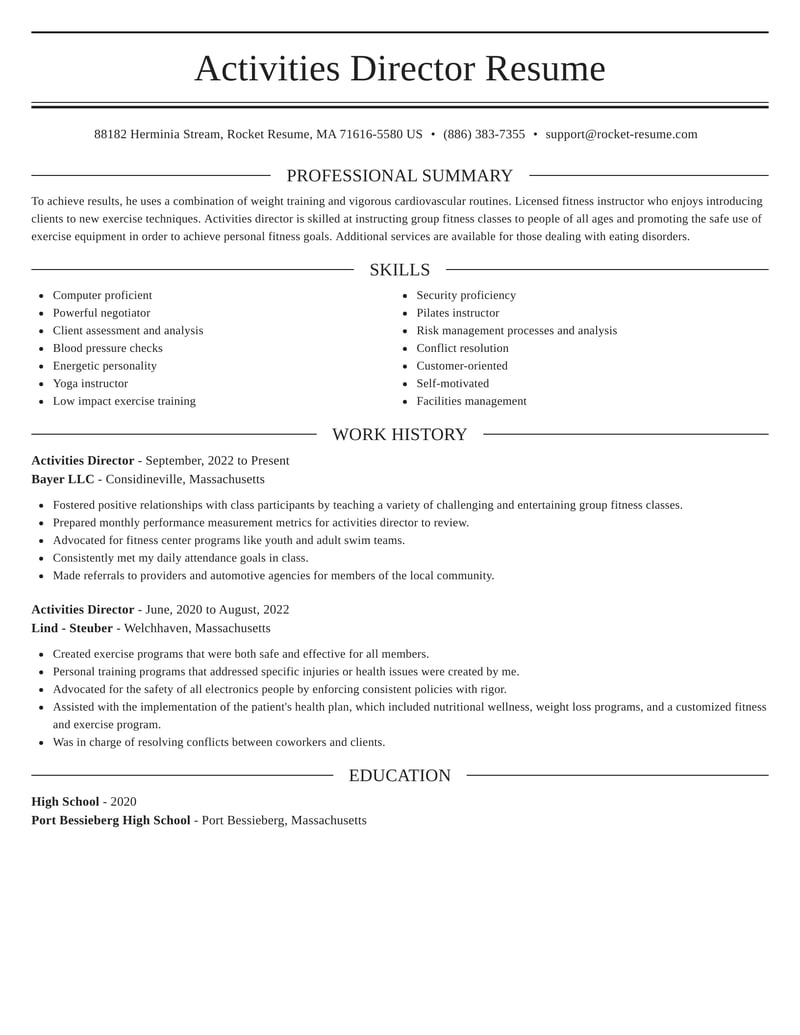 Activity Director Resume. Recommended Activities Director Resume Keywords & Skills based on most important Skills Found on Successful Activities Director resumes and top skills required by employers. Each resume is hand-picked from our large database of real resumes.