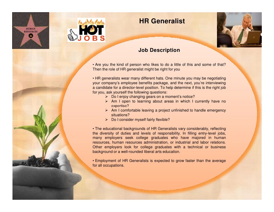 The HR generalist is probably the most varied HR professional out there. Human Resources generalists work for the development of the department, employment, employee relations, HR information system, training, employee development, etc. Are you strong enough to implement a variety of human resource programs?